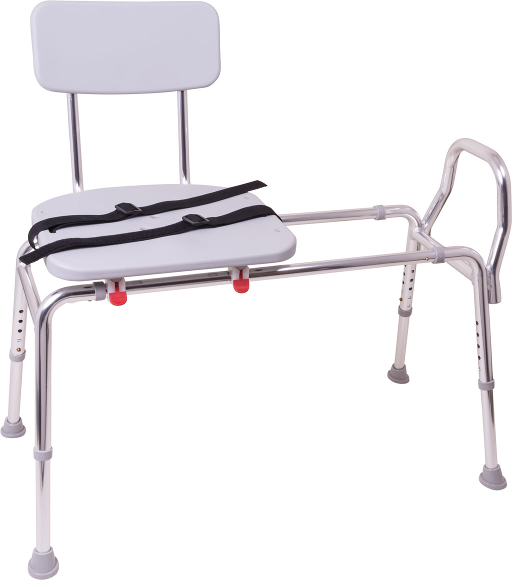 The Sliding Transfer Bench with Seat and Back provides an easy way to transfer in and out of the tub. The bench slides smoothly left and right along the frame, and comes equipped with a seat belt for added safety.
