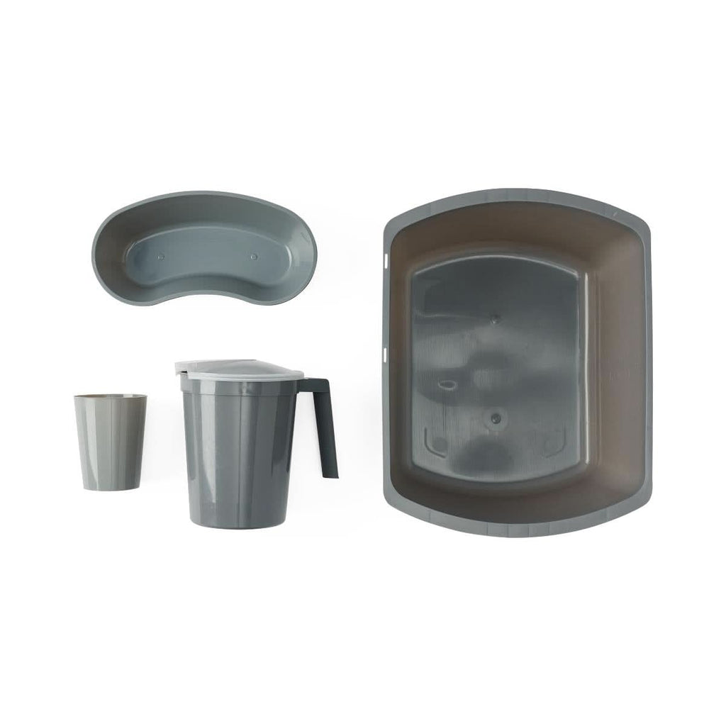 Features & Benefits:- Kit includes: 17 oz. (500 mL) emesis basin, pitcher with handle and lid, 9 oz. (266 mL) tumbler and 6 qt. (6 L) rectangular wash basin