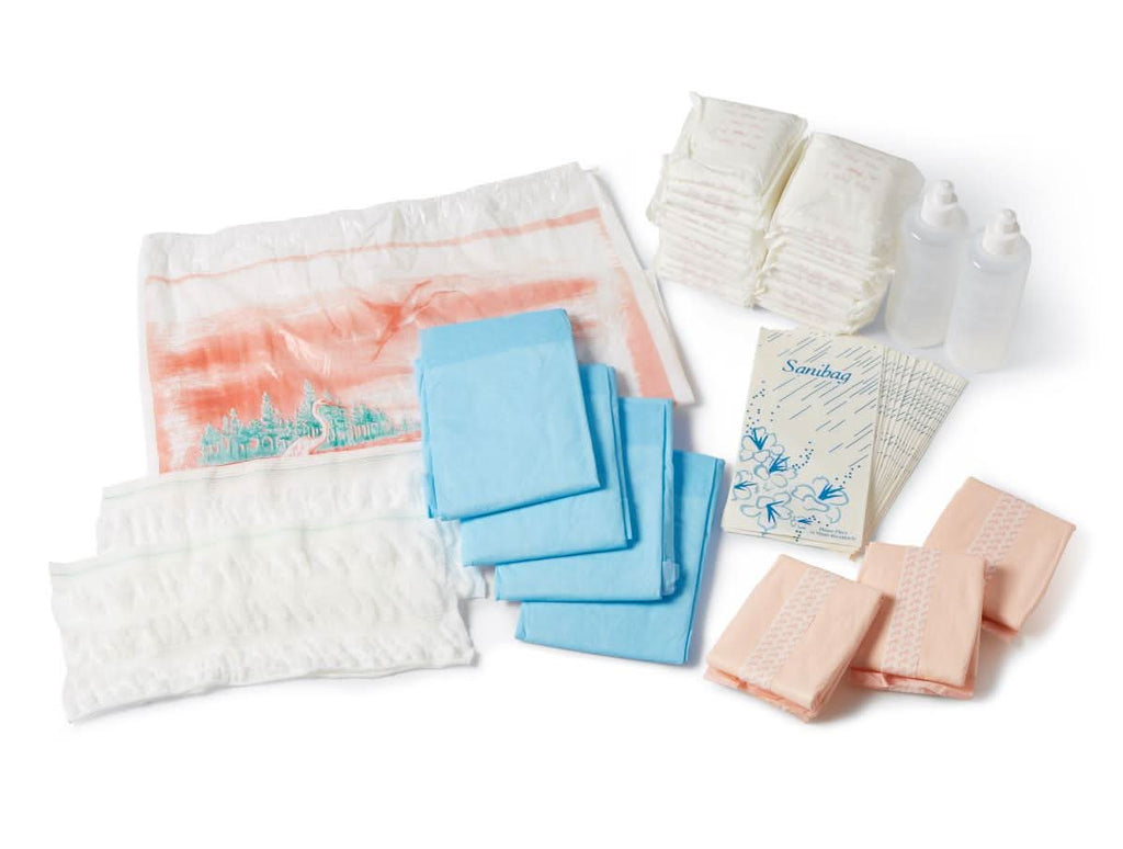 Features & Benefits:- Kit includes patient belonging bag (18" x 20" x 4"); 3 contour polymer liners (peach); 2 mesh panties, size XL (32" to 48" waist); 12 nonsterile sanitary maxi pads with wings (11" L); peri bottle with lid (8 oz.);16 sanitary paper bags (4" x 2" x 8"); 4 economy fluff underpads (23" x 24")