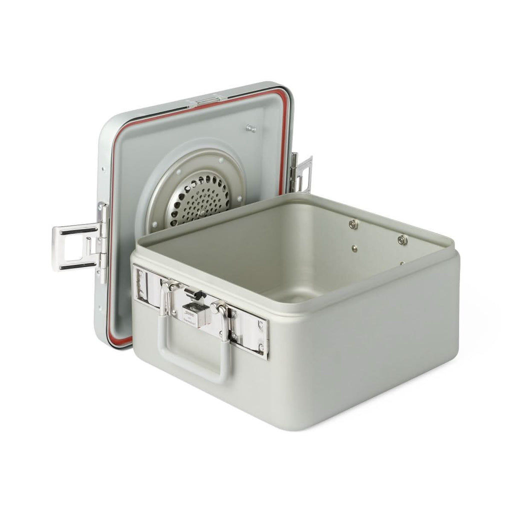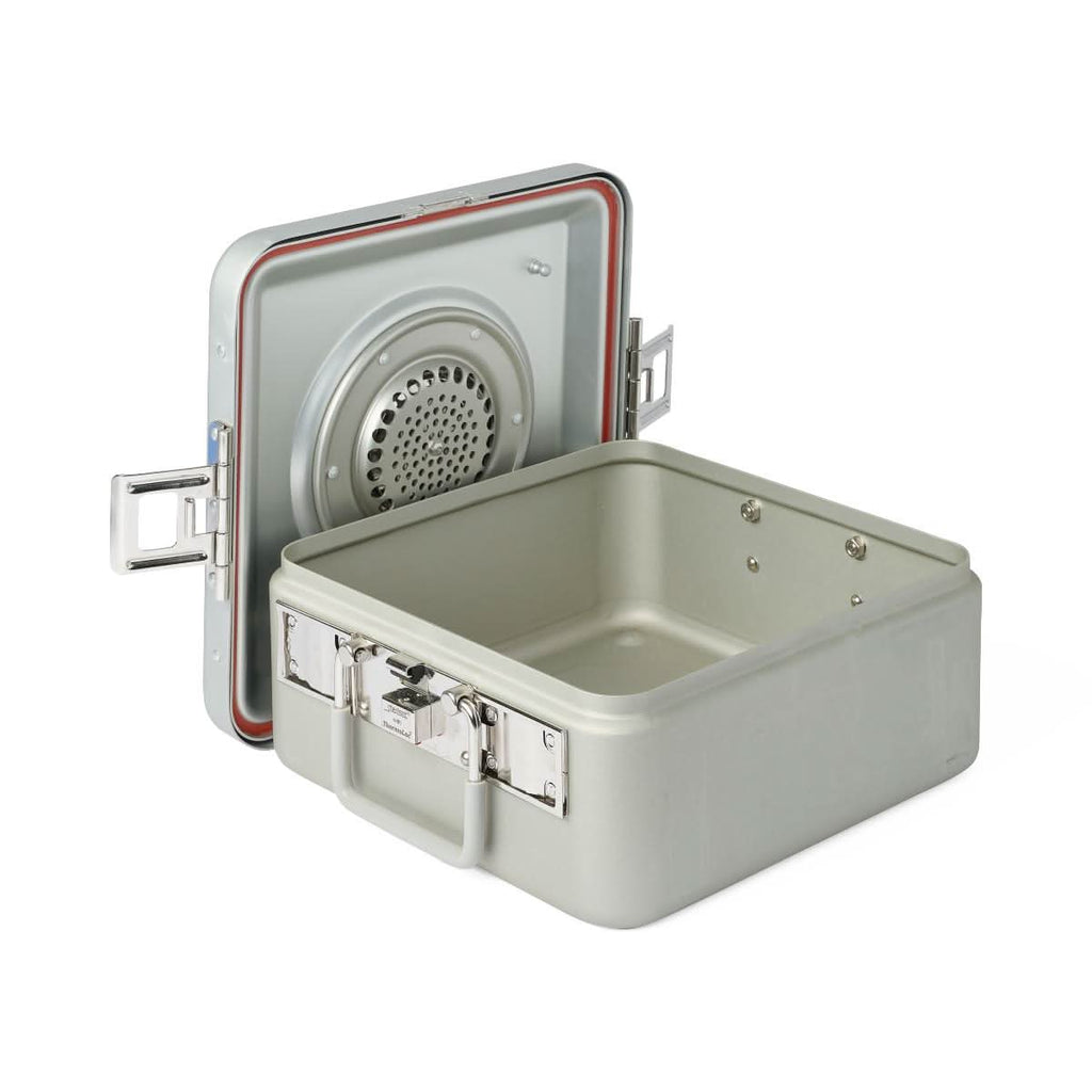 - Steriset Sterilization Container with Flat Bottom and Aluminum Lid, Half-Size, Gray Handle, 12" x 10.75" x 4.5"