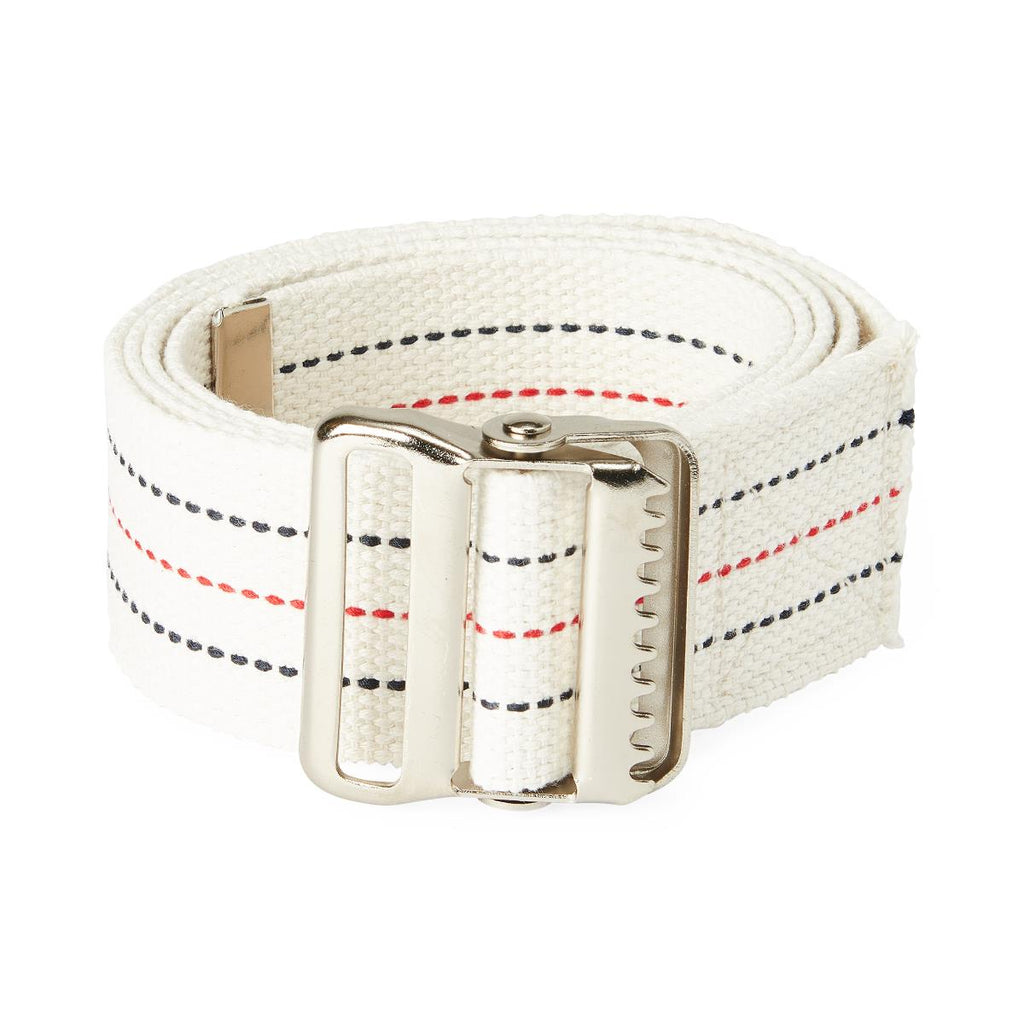 - Transfer Belts: These cotton belts are designed to aid caregivers as they assist patients with walking. Fits around patient's waist. Metal buckle. Washable, 60"L. White With Blue & Red Pinstripes.