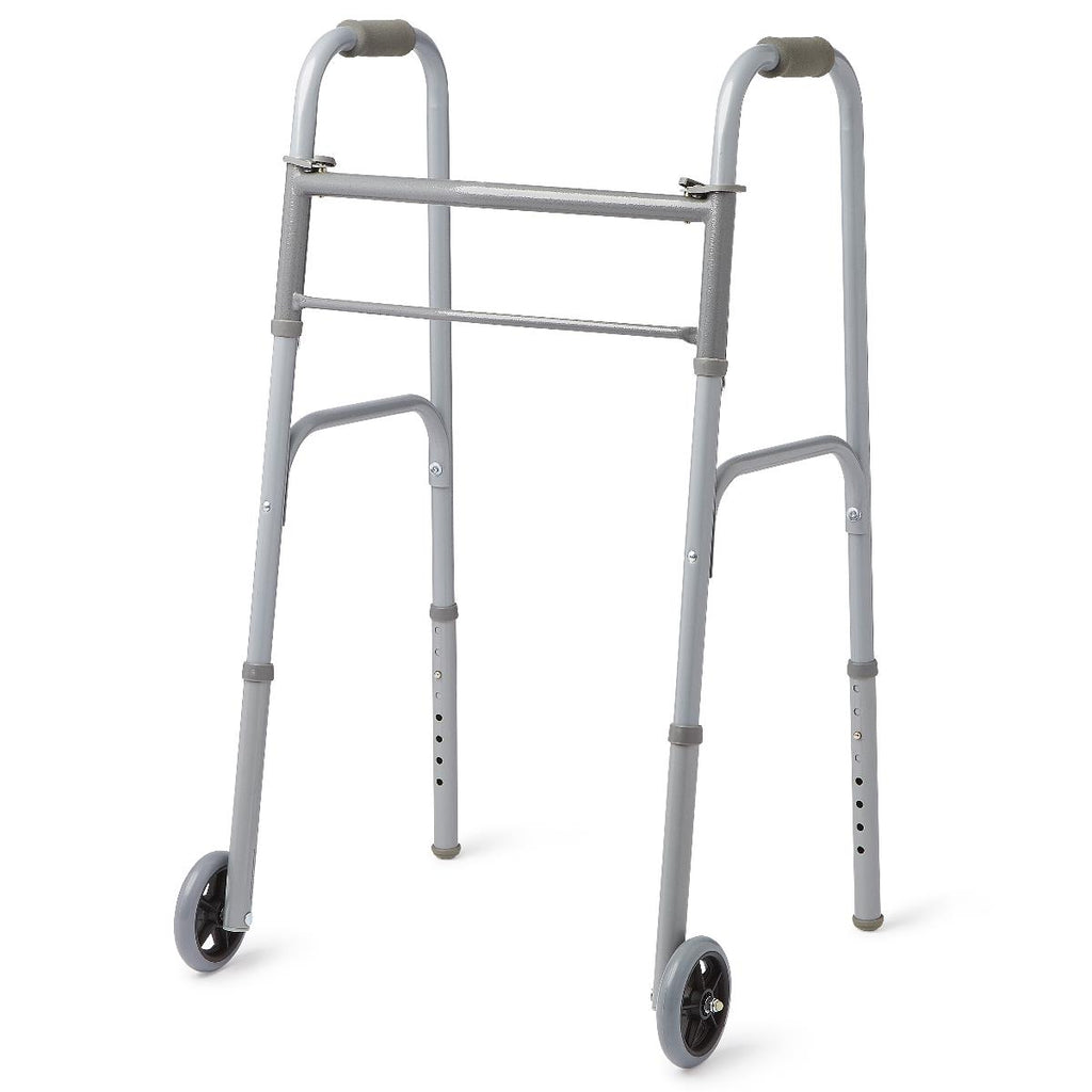 Features & Benefits:Medline Two-Button Folding Walker with Front Wheels
